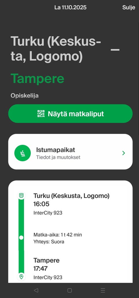 5 €Junalippu la 11.10 16:05-17:47 Turku-Tampere (opiskelija)Tampere, Tampere Keskus, Pirkanmaa10 tLisää suosikiksi.