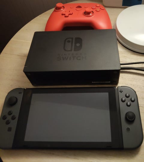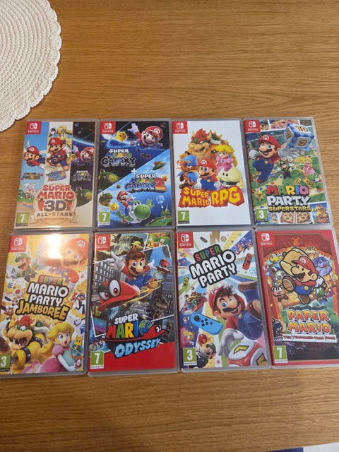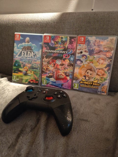 Nintendo Switch OLED -pelikonsoli valkoisilla ohjaimilla ja Mario Kart 8 Deluxe