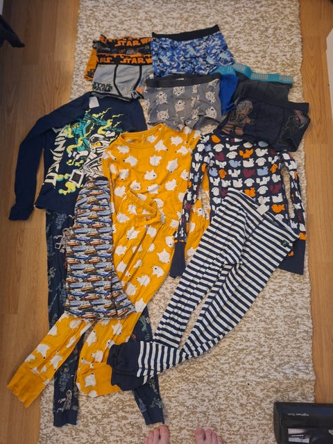 POLARN O PYRET Raitapaita, Raitahousut sekä H&M Collegepaita Koko 134/140.