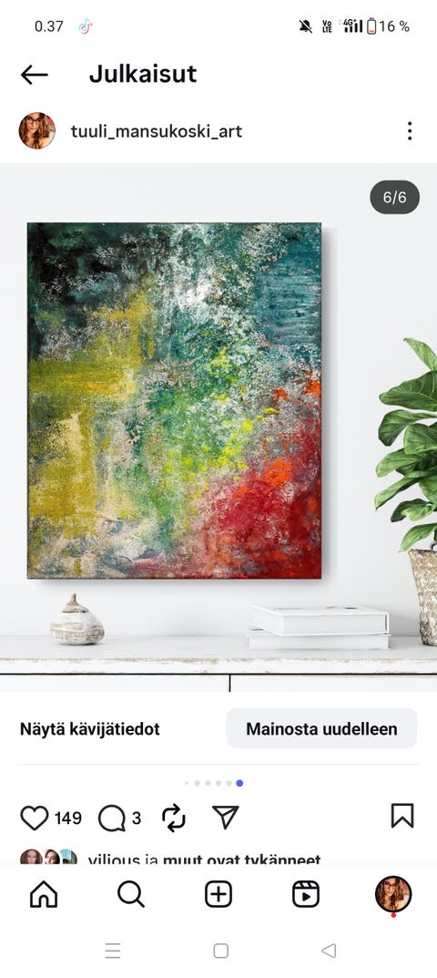 Taide tekee monelle kodin tunnun. Taide voi näkyä sisustuksessa monessa muodossa: seinillä voi olla maalauksia, grafiikkaa, litografiaa ja valokuvataidetta. Myös ryijy voi olla ainutlaatuinen taideteos. Ikkunalaudoilla tai hyllyillä olevat veistokset ja lasitaide kertovat, millaisesta taiteesta kodin asukas pitää. Seuraavaa taidehankintaa suunnitellessa kannattaa kurkata Torin valikoimat - Suomen suurimmassa kauppapaikassa on nytkin 21 442 ilmoitusta, joissa myydään, ostetaan tai annetaan erilaisia taideteoksia.