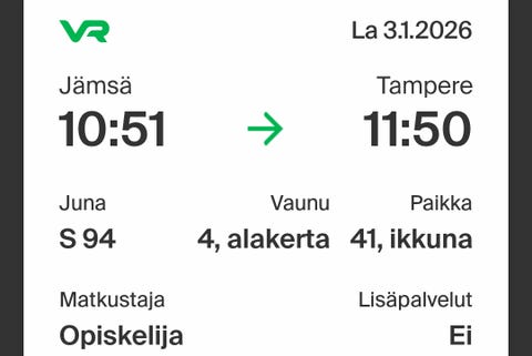 5 €Opiskelijalippu Jämsä - Tampere La 3.1.2026 klo 10.51Tampere, Vuores, Pirkanmaa16 minLisää suosikiksi.