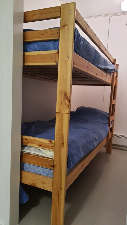 Kaksi puista sänkyä patjoineen