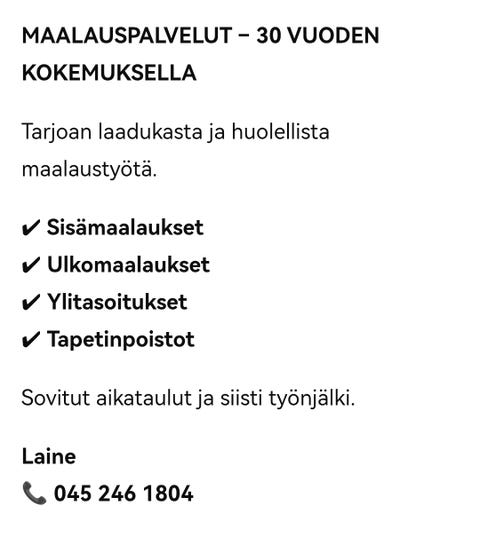 Antiikki ja taide (428)Auto-, vene- ja moottoripyörätarvikkeet (763)Elektroniikka ja kodinkoneet (94)Eläimet ja eläintarvikkeet (35)Koti ja sisustus (2 812)Lapset ja vanhemmat (822)Liiketoiminta ja palvelut (102)Piha ja remontointi (2 272)Urheilu ja ulkoilu (379)Vaatteet, kosmetiikka ja asusteet (202)Viihde ja harrastukset (1 292)