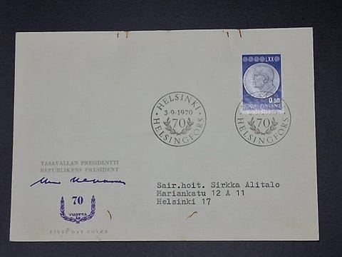 1 €Ensipäiväkuori FDC Presidentti Urho Kekkonen 70 vuotta 3.9.1970Tampere, Haukiluoma-Ikuri, Pirkanmaa5 pvLisää suosikiksi.