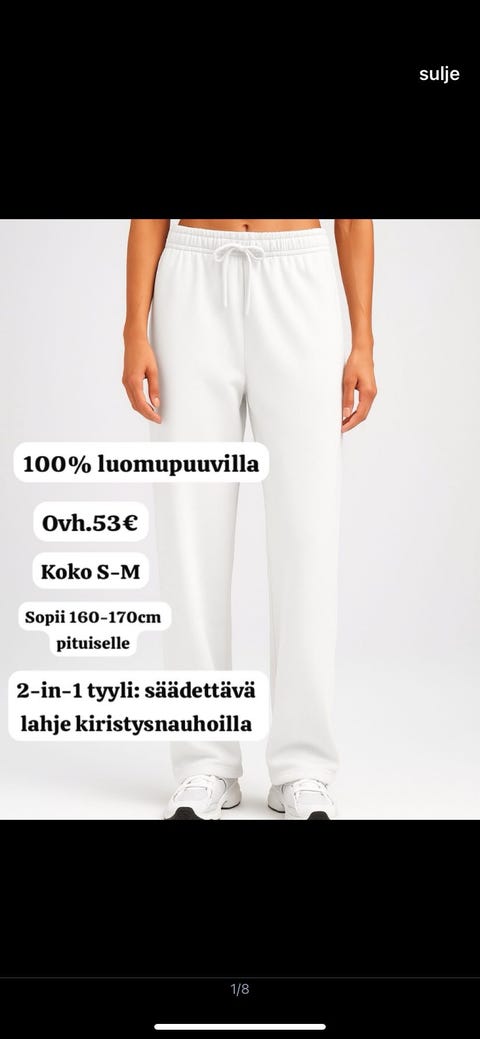 Antiikki ja taide (834)Auto-, vene- ja moottoripyörätarvikkeet (6 894)Elektroniikka ja kodinkoneet (3 140)Eläimet ja eläintarvikkeet (1 536)Koti ja sisustus (11 982)Lapset ja vanhemmat (6 274)Liiketoiminta ja palvelut (796)Piha ja remontointi (2 163)Urheilu ja ulkoilu (9 133)Vaatteet, kosmetiikka ja asusteet (86 659)Viihde ja harrastukset (5 785)