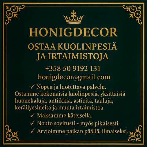 Antiikki ja taide (23)Auto-, vene- ja moottoripyörätarvikkeet (48)Elektroniikka ja kodinkoneet (156)Eläimet ja eläintarvikkeet (25)Koti ja sisustus (692)Lapset ja vanhemmat (31)Liiketoiminta ja palvelut (51)Piha ja remontointi (107)Urheilu ja ulkoilu (32)Vaatteet, kosmetiikka ja asusteet (21)Viihde ja harrastukset (101)