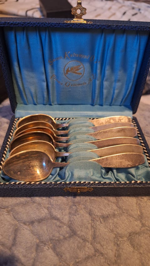 Jos hankit aterimia ja pöytähopeita käytettynä, muistathan että niitä kannattaa kiillottaa säännöllisesti. Netistä löydät runsaasti vinkkejä esimerkiksi hopean puhdistukseen. Toki vanhassa esineessä saa monen mielestä myös näkyä jonkin verran ajan patinaa. Myös oikea säilyttäminen auttaa pitämään vanhat hopeat kiiltävinä: pöytähopeat kannattaa säilyttää joko alkuperäisissä laatikoissa tai esimerkiksi puuvilla- tai minigrip-pusseissa, mieluiten valolta suojattuna.