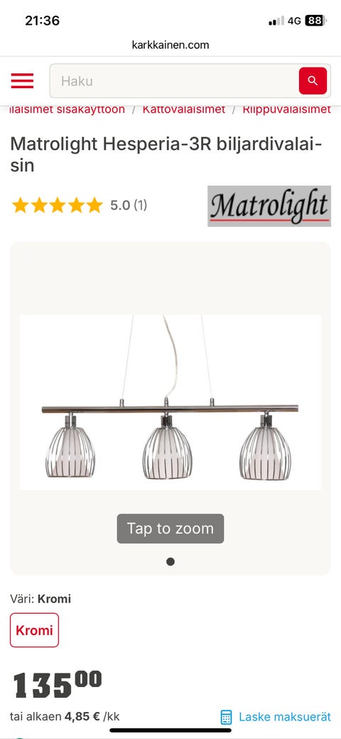 35 €Matrolight riippuvalaisin kolmella valaisimellaLahti, Uusikylä, Päijät-Häme26.1.Lisää suosikiksi.