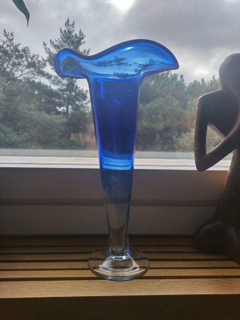 10 €Sininen lasinen maljakko korkea muotoiltu reunaKaarina, Piispanristi, Varsinais-Suomi12 minLisää suosikiksi.