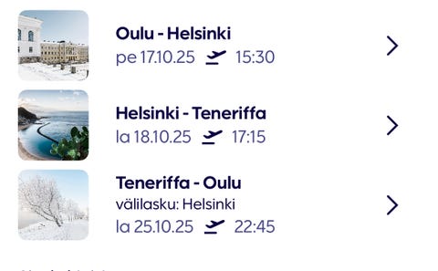 350 €Syysloma: Oulu - Teneriffa - Oulu lennot (17.-25.10.25)Oulu, Korvensuora, Pohjois-Pohjanmaa18 tLisää suosikiksi.