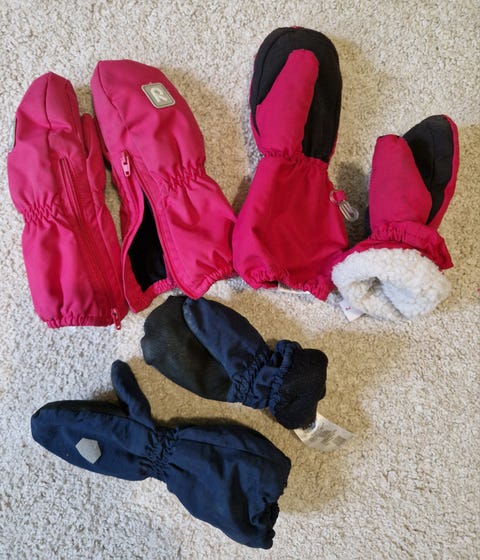 Lasten hanskat menevät liikkuessa ja ryömiessä jatkuvasti likaiseksi, minkä huomaakin pyykkimäärästä. Kotona kannattaakin olla useammat lasten rukkaset ja hanskat. Näistä voi hyvin ostaa ainakin osan käytettynä ja säästää näin vaatebudjetissa.