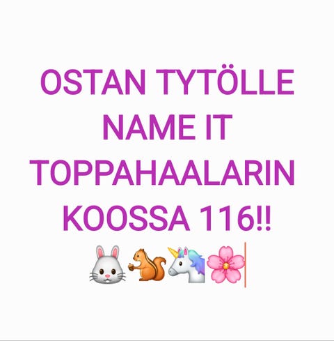 Antiikki ja taide (1 888)Auto-, vene- ja moottoripyörätarvikkeet (5 211)Elektroniikka ja kodinkoneet (6 172)Eläimet ja eläintarvikkeet (1 088)Koti ja sisustus (19 418)Lapset ja vanhemmat (11 975)Liiketoiminta ja palvelut (1 022)Piha ja remontointi (2 827)Urheilu ja ulkoilu (4 170)Vaatteet, kosmetiikka ja asusteet (19 009)Viihde ja harrastukset (23 109)
