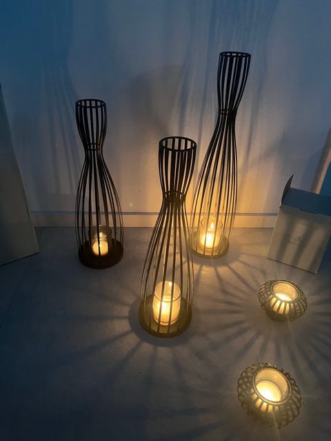Hanki useampi erilainen, mutta samantyylinen kynttilänjalka ja tee niistä kollaasi juhlapöytään
