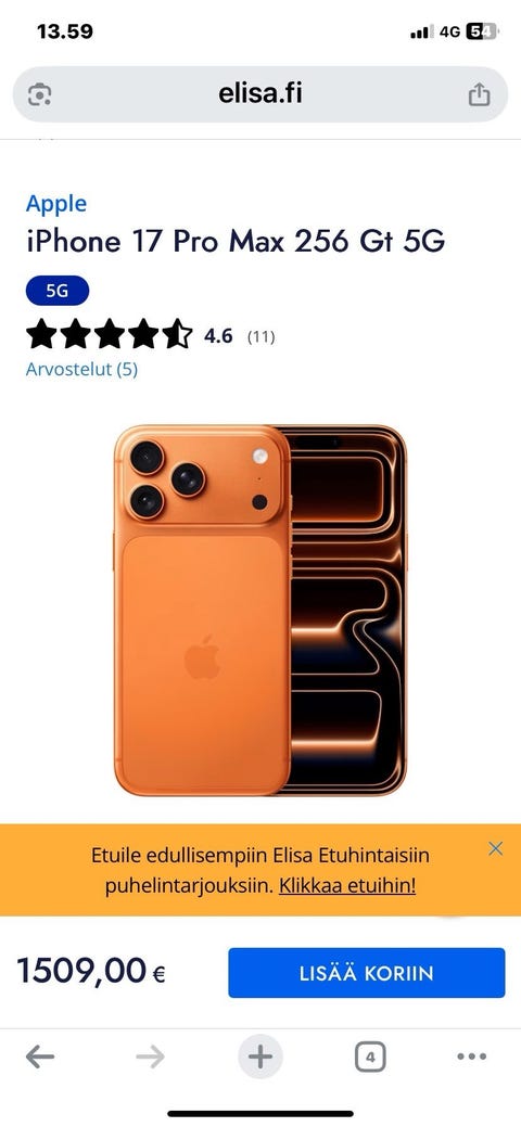1 175 €Apple iPhone 17 Pro 256 GB Cosmic Orange 256GB - BUNDLE 256 GB AppleMikkeli, Mikkeli Keskus, Etelä-Savo15.11.2025Osta hetiPaalupaikkaLisää suosikiksi.