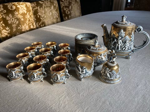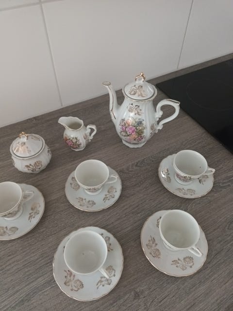 50 €12 hengen kahvikalusto. Lysterimaalattu, 24 karaatin kultauksella.Pori, Sampola, Satakunta10.11.Lisää suosikiksi.
