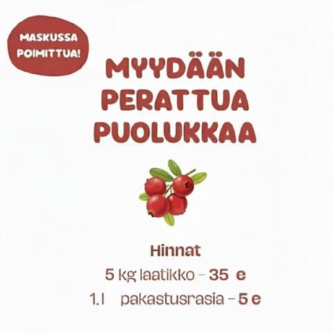 35 €Puolukkaa Raumalla 10 litran ämpäri 35 Euroa kotiinkuljetettuna.Rauma, Paroalho, Satakunta20.9.Lisää suosikiksi.