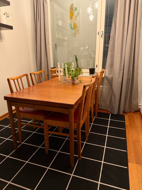 Ruokailuryhmä on usein melko arvokas hankinta ja usein kotona kovassa käytössä. Esimerkiksi taloudessa, jossa on yksi tai useampi pieni lapsi, ruokapöytään ja tuoleihin saattaa tulla naarmuja ja tahroja. Kannattaakin miettiä, voisiko käytetty pöytä olla omaan tarpeeseen riittävä ratkaisu. Ostamalla käytettyjä kodin kalusteita tuet myös kiertotaloutta!