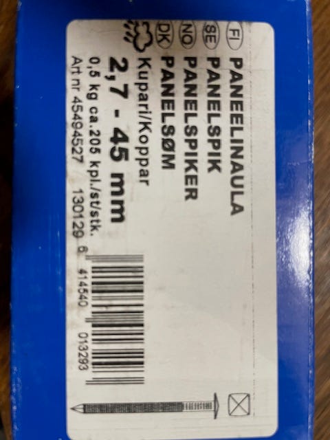 10 €Kuparinauloja/paneelinaula 2,7 x 45 mm 130 kpl x 8 ltkJyväskylä, Keltinmäki, Keski-Suomi23.11.Lisää suosikiksi.