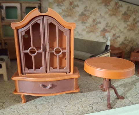 Nukkekodin vitriini ja pöytä