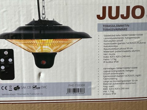 50 €Jujo PHE-1500BR Terassilämmitin 1500W mustaLahti, Lahti Asemanseutu, Päijät-Häme1 minOsta hetiLiikkeessä oleva kuorma-autoToriDiiliLisää suosikiksi.