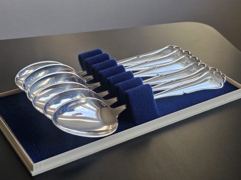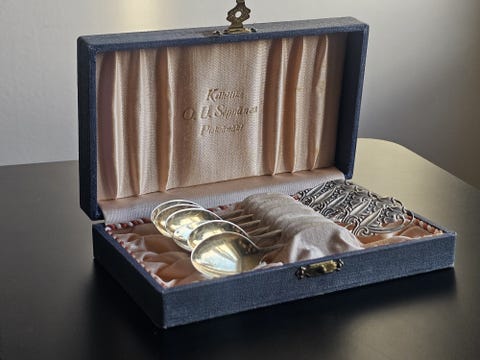 Jos hankit aterimia ja pöytähopeita käytettynä, muistathan että niitä kannattaa kiillottaa säännöllisesti. Netistä löydät runsaasti vinkkejä esimerkiksi hopean puhdistukseen. Toki vanhassa esineessä saa monen mielestä myös näkyä jonkin verran ajan patinaa. Myös oikea säilyttäminen auttaa pitämään vanhat hopeat kiiltävinä: pöytähopeat kannattaa säilyttää joko alkuperäisissä laatikoissa tai esimerkiksi puuvilla- tai minigrip-pusseissa, mieluiten valolta suojattuna.