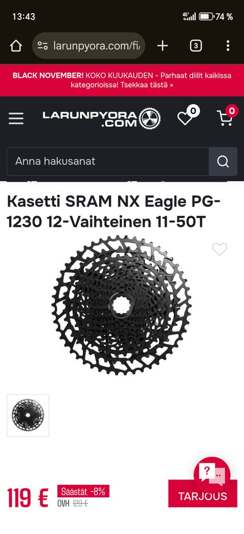 70 €Cassette Sram eagle 12 gears 11-50tJoensuu, Joensuu Keskus Pohjoinen, Pohjois-Karjala3 pvLisää suosikiksi.