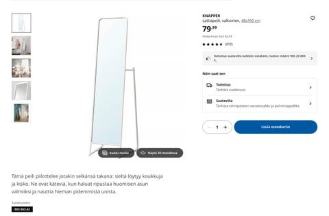 Kokovartalopeili on käytännöllinen ja voi olla malliltaan joko seinälle kiinnitettävä tai seisova malli. Torista voit löytää arkisen peruspeilin tai uniikin, vanhan peilin, joita ei kaupoista enää saa!