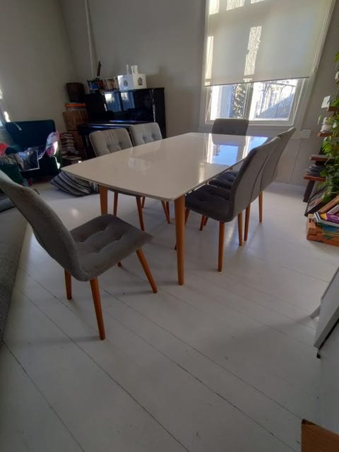 200 €Ruokapöytä ja tuolit 6kpl valkoinen harmaa maitolasi 95x180cmTurku, Kuninkoja-Mälikkälä, Varsinais-Suomi7.2.Lisää suosikiksi.
