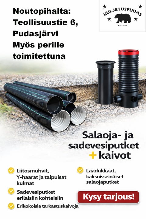 15 €Sadevesi- ja salaojakaivot sekä rumpuputketPudasjärvi, Pudasjärvi Keskus, Pohjois-Pohjanmaa6 pvLisää suosikiksi.