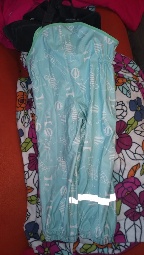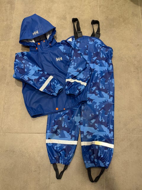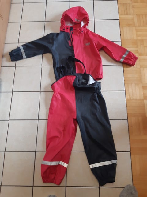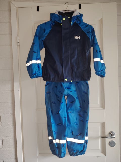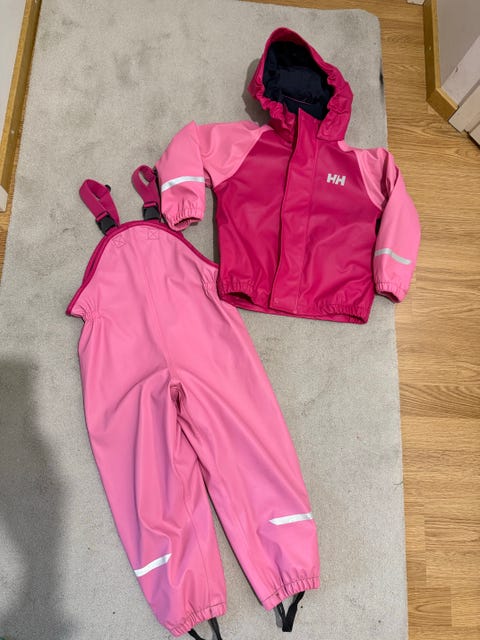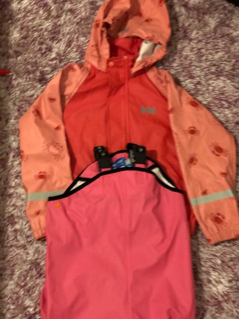 Tyttöjen Jonathan lasten sadetakki koko 122 ja Helly Hansen sadehousut koko 122