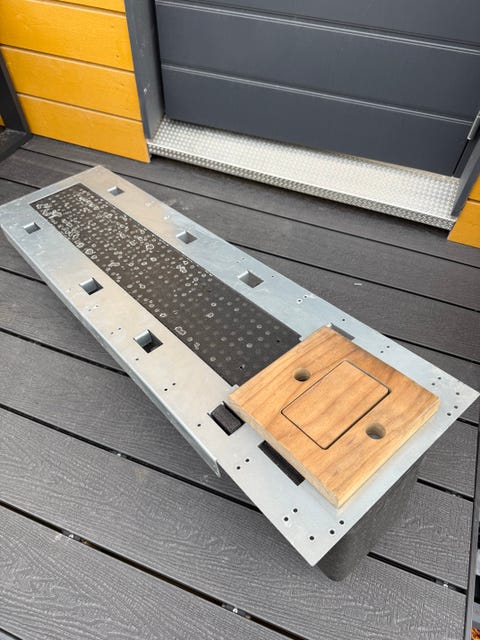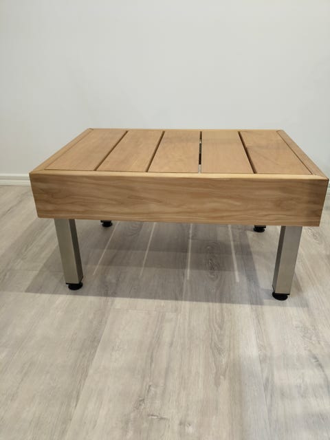 Puinen penkki metallijaloilla.