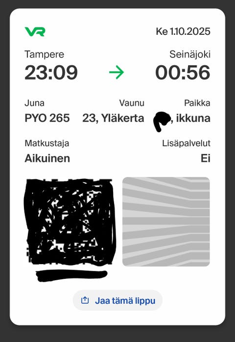 7 €Myydään VR junalippu 30.10.2025 Pasila - TurkuTurku, Nummi-Ylioppilaskylä, Varsinais-Suomi31.8.Lisää suosikiksi.