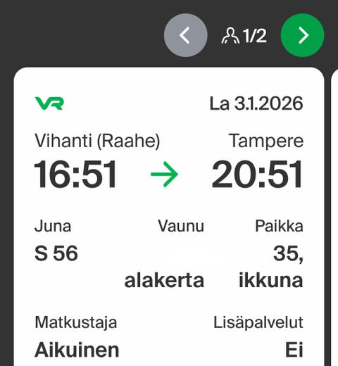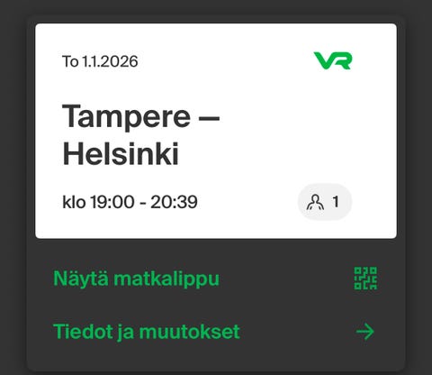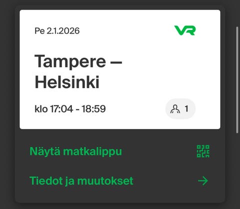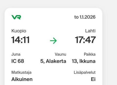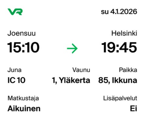 15 €Junaliput 3-4.1.2026 Jkl-Tre/Tre/JklJyväskylä, Ritoniemi-Lohikoski, Keski-Suomi3 pvLisää suosikiksi.
