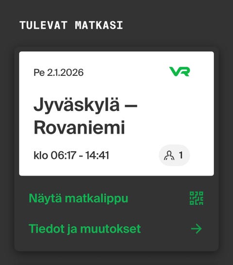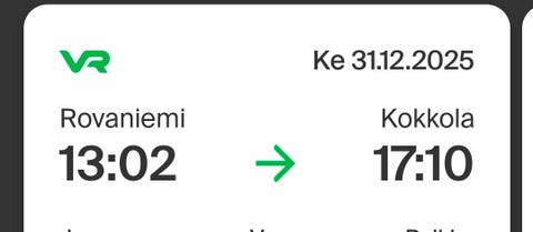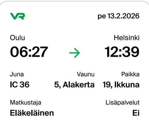14 €Edullinen eläkeläis junalippu 7.1.2026 Rovaniemi-TikkurilaRovaniemi, Niemelänkangas-Korvanniemi, Lappi1 pvLisää suosikiksi.