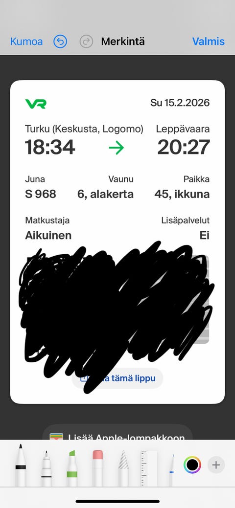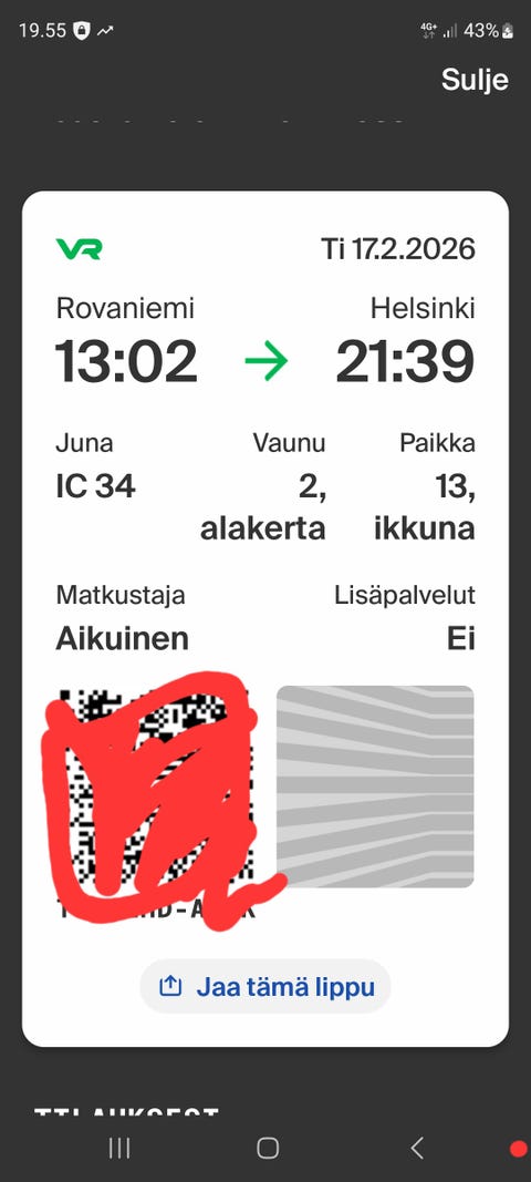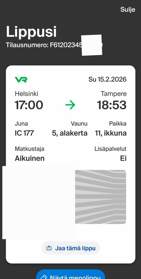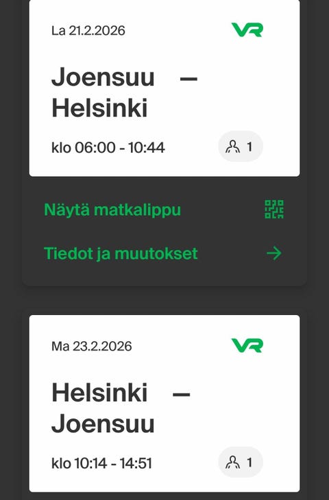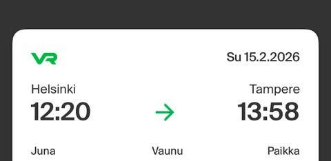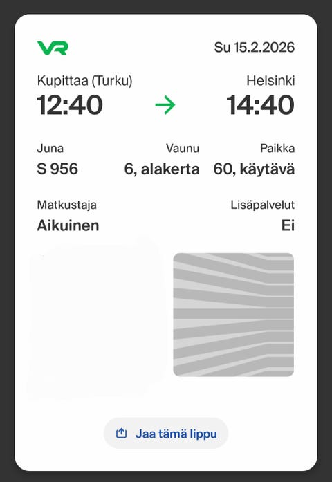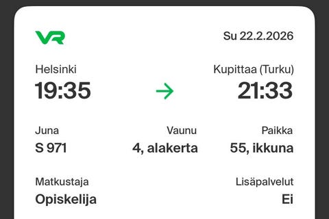 5 €VR junalippu Helsinki–Kupittaa opiskelijalle 22.2Helsinki, Tapaninvainio, Uusimaa1 pvLisää suosikiksi.