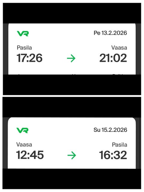 70 €Junaliput Pasila–Vaasa–Pasila 13.2.2026 ja 15.2.2026Espoo, Kauklahti, Uusimaa1 pvLisää suosikiksi.