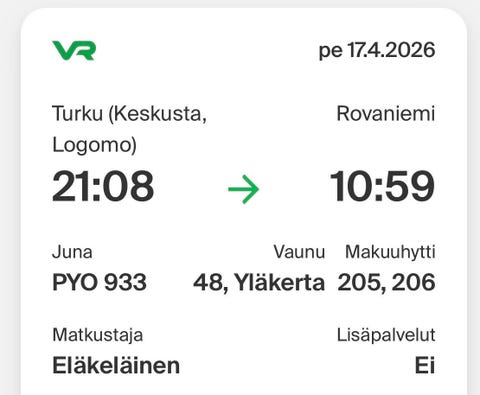 150 €VR yöjunamatkalippu 17.4. Turku–Rovaniemi 2 x eläkeläinenKauniainen, Kauniainen, Uusimaa1 pvLisää suosikiksi.