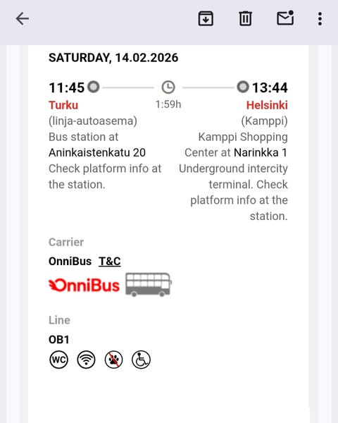 4 €Onnibus lippu Turku - Helsinki la 14.2. klo 11.45Turku, Moikoinen-Pikisaari, Varsinais-Suomi17 tLisää suosikiksi.