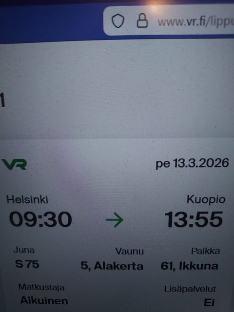 Aurinko ja vuoretMyydäänJunalippu Helsinki-KuopioHelsinki, Etelä-Vuosaari, Uusimaa1 pvLisää suosikiksi.