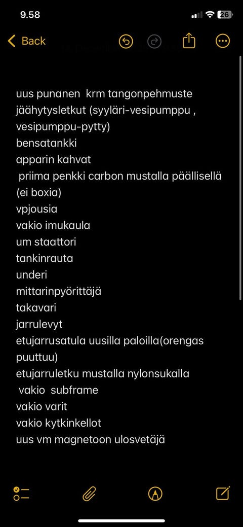 Moottoripyörän varaosat voivat välillä olla hintavia. Moottoripyöräsi voi olla myös jo melko paljon elämää ja kilometrejä nähnyt rakas ajopeli, ja varaosan hankkiminen uutena voi tällöin olla haastavaa. Kannattaakin katsoa, löytyisikö sopiva mototarvike Torista! Torista löydät 32 642 ilmoitusta, joissa myydään ja ostetaan varaosia ja muita tarvikkeita motoihin.