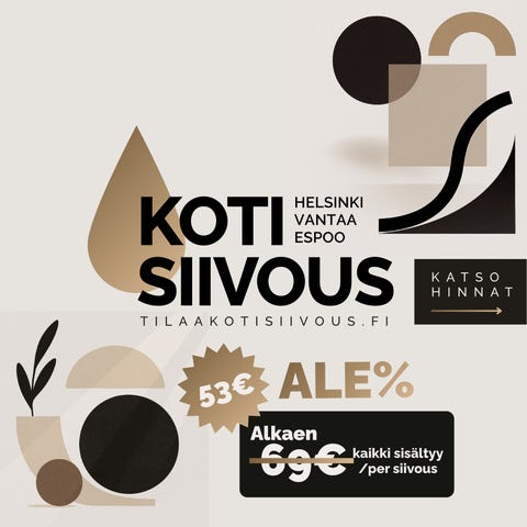 Tilaa Kotisiivous on kotisiivoukseen erikoistunut pieni palveluyritys, joka tarjoaa selkeähintaisia siivouspalveluja pääkaupunkiseudulla. Työ tehdään kiinteään hintaan – ei tuntiveloitusta eikä lisäkuluja. Hinta määräytyy asunnon koon mukaan ja sisältää kaikki siivousaineet, välineet sekä ALV:n.